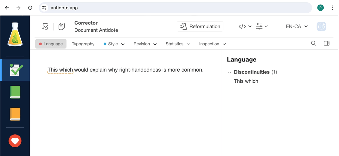 MP: To give you a more concrete example of what’s possible with Antidote: You can now use the Reformulation feature to resolve discontinuities flagged by the application. Discontinuities are bits of text the corrector marks with dotted orange underlining to indicate where it has trouble analyzing the text.