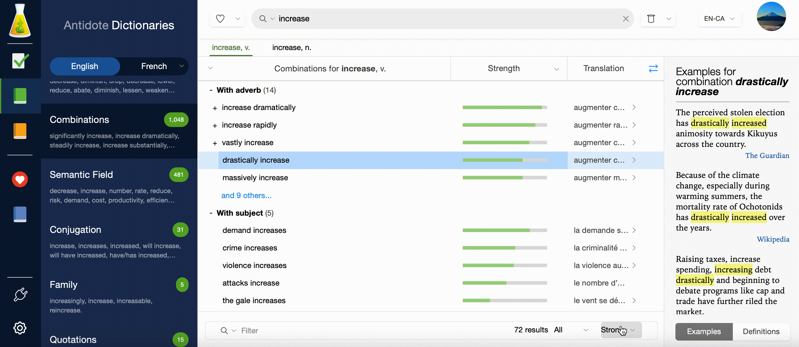 All in all, you’ll soon find the dictionary of combinations to be an essential tool—whether you’re looking for the perfect adjective, the appropriate verb or the most evocative adverb for your text. Check out the Antidote User Guide for all the details.