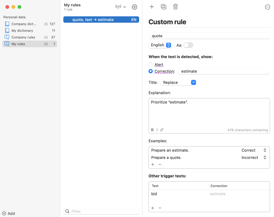 Another feature that is especially useful when writing for others is the option to define your own rules for the corrector. Some of your clients’ preferences will almost certainly differ from yours. Perhaps you usually translate the French word estimation as quote, but one of your clients prefers estimate.