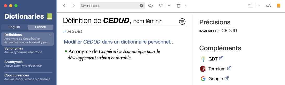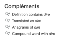Include external resources in your hunt for the perfect translation by clicking the links at the bottom of the Compléments/More panel. Your browser will automatically launch a search in the corresponding resource for the word displayed in the Dictionaries window.