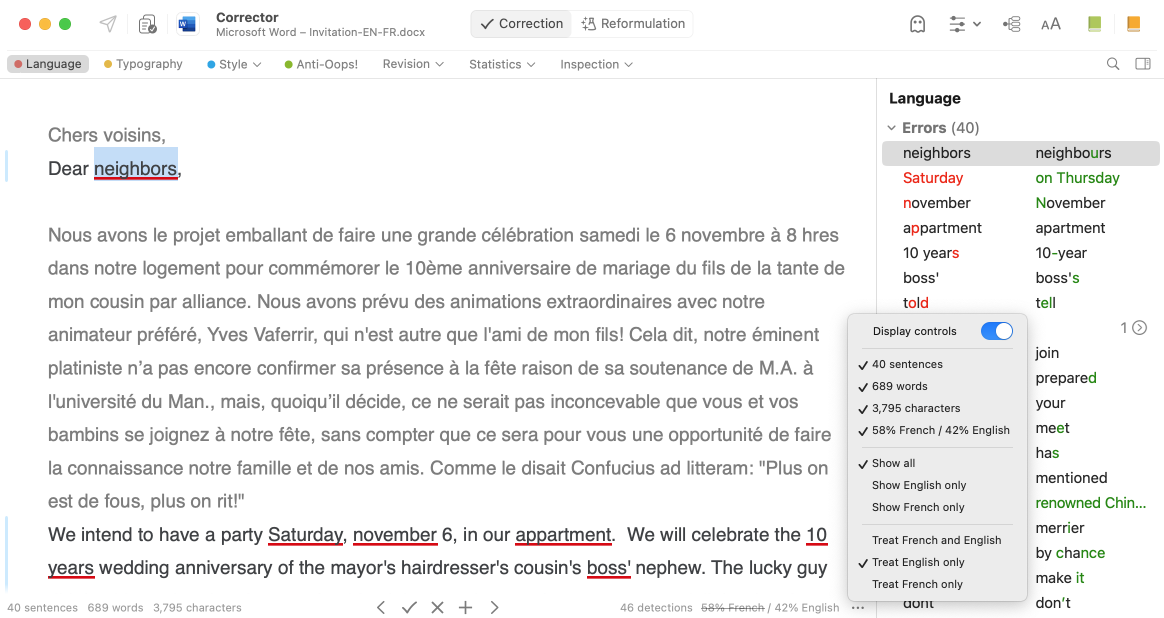 If you’re working in a multilingual document, the corrector allows you to display only the English text or only the French. It can correct each language individually as well.