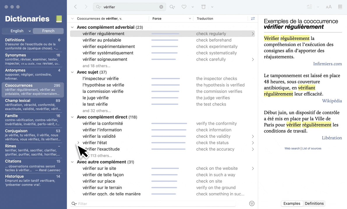 The dictionary of combinations lists all the most notable lexical combinations of a given word—those with a strong, frequent and spontaneous association in the language. What’s more, every entry is translated so you can find an equivalent phrase without having to search for the secondary word. It also allows you to check how the expression is used through the examples provided in the right-hand panel.