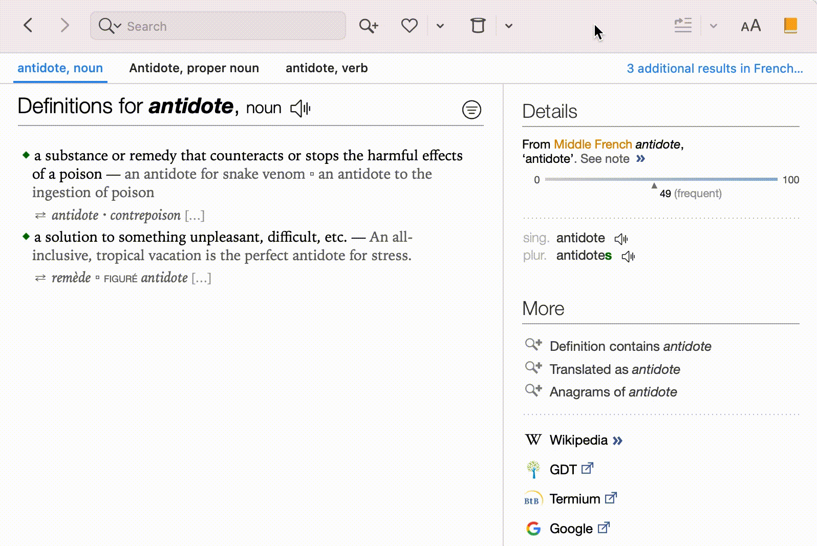 If you ever need a hand to start the game or to solve it, Antidote’s powerful dictionary search engines are at your disposal. Here’s how to use them wisely.