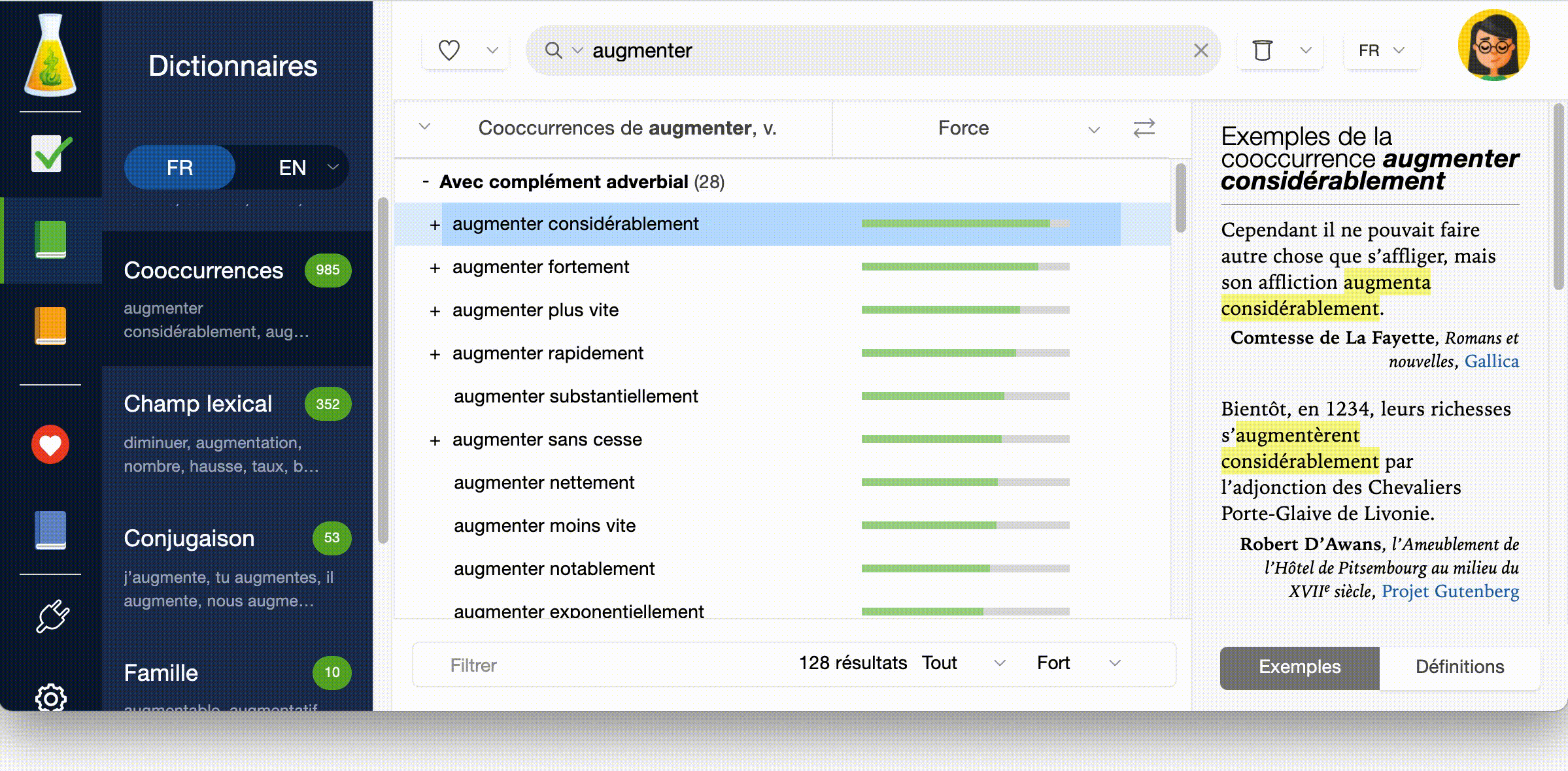 Le filtre de sens départagera l’intensité dans une liste de cooccurrence. Si vous cherchez un adverbe pour accompagner le mot augmenter, le filtre fort proposera augmenter considérablement; et le faible, augmenter sensiblement.