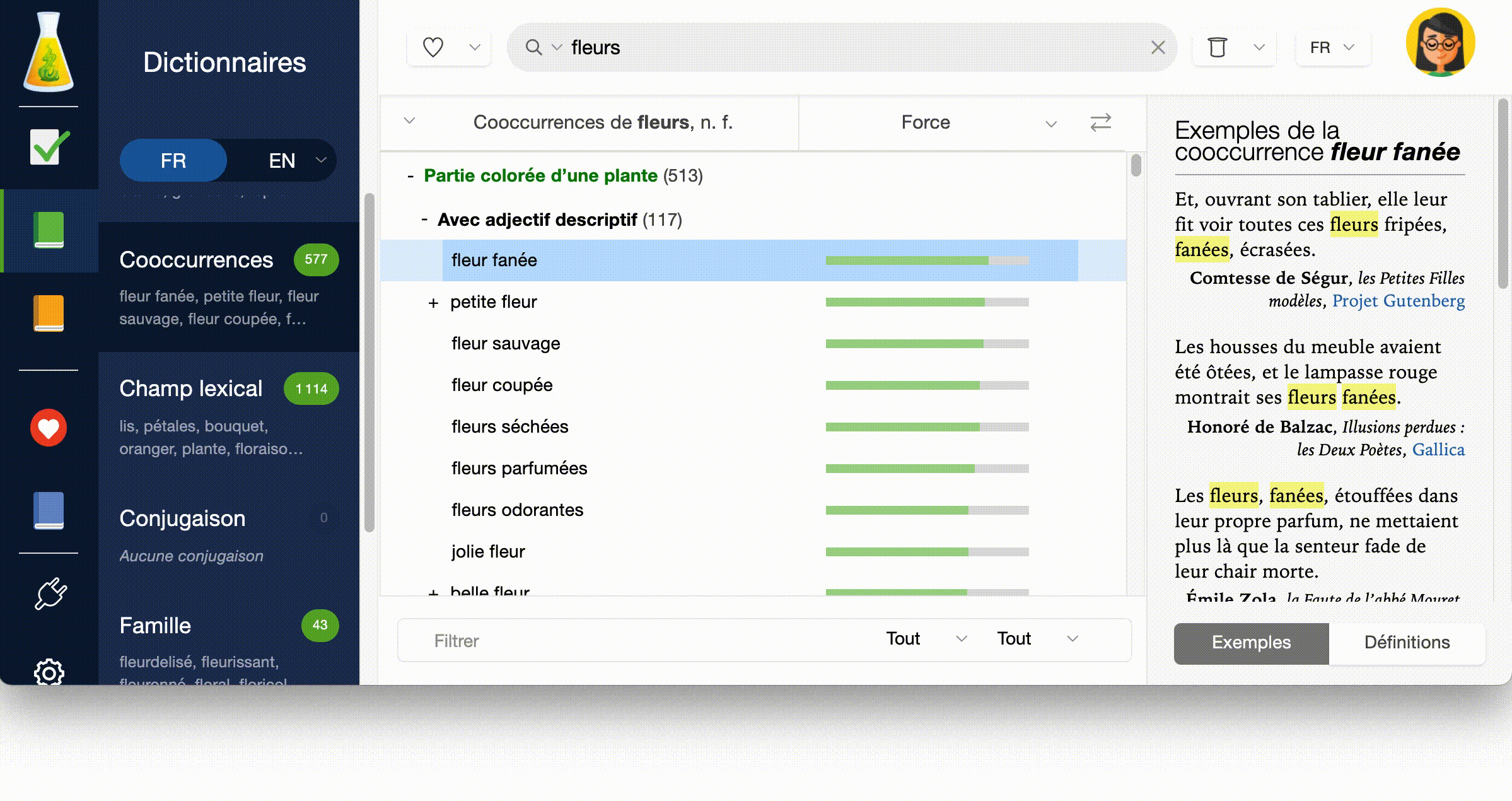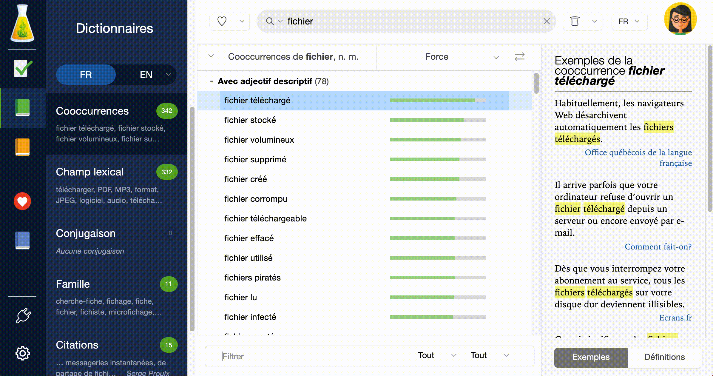 Notre dictionnaire des cooccurrences présente les combinaisons lexicales les plus remarquables d’un mot, c’est-à-dire celles dont l’association dans la langue est forte, fréquente et spontanée. Elles sont classées selon les divers sens du mot, s’il y a lieu, puis par contexte syntaxique (épithètes, sujets, compléments, etc.) et finalement par la force de cooccurrence. Le dictionnaire compte au total 900 000 cooccurrences avec autant de phrases d’exemples.