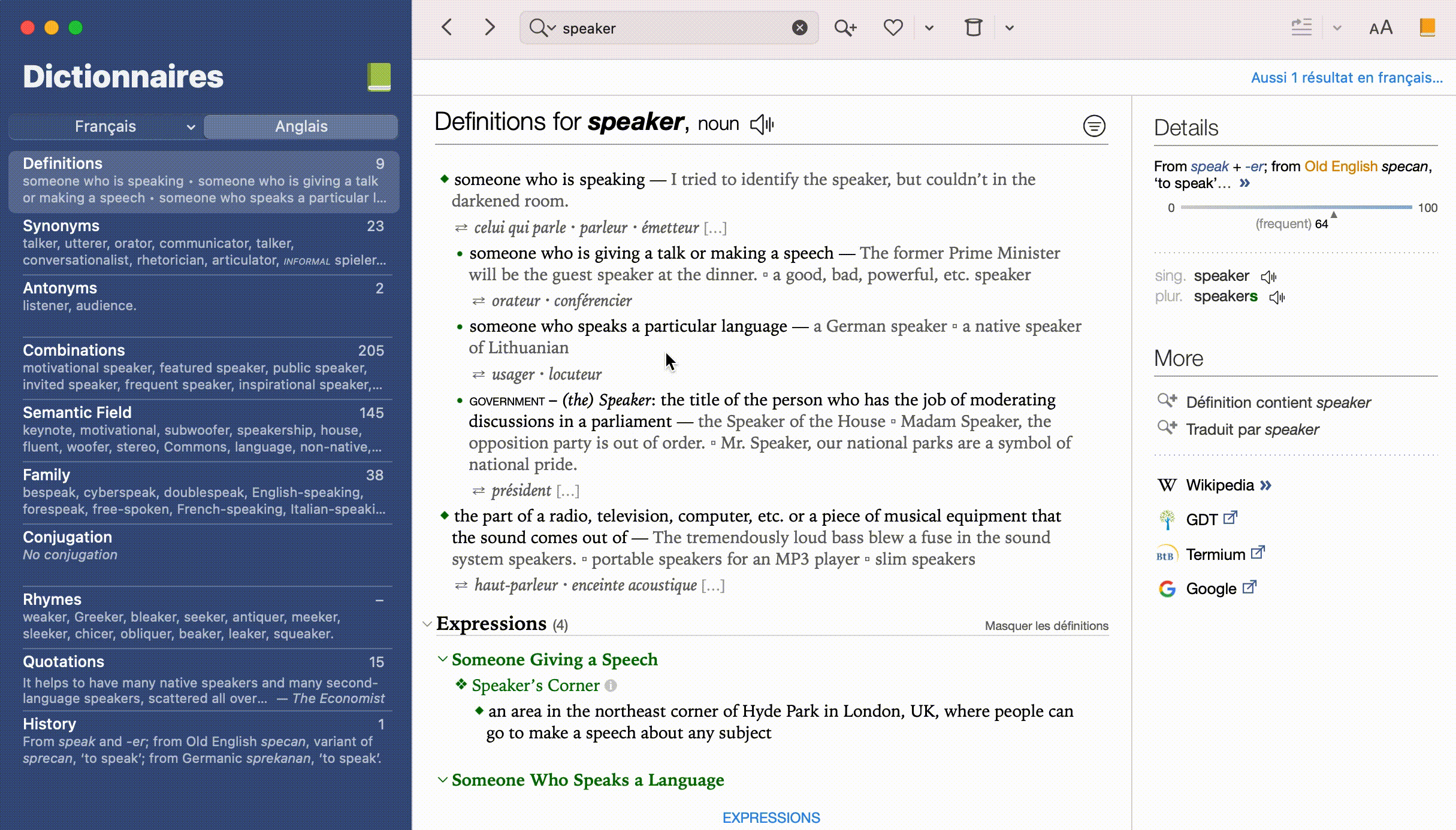 Un doubleclic, lui, ouvre le dictionnaire en français pour ce mot. Vous pouvez alors continuer à peaufiner votre recherche, entre autres avec les synonymes.