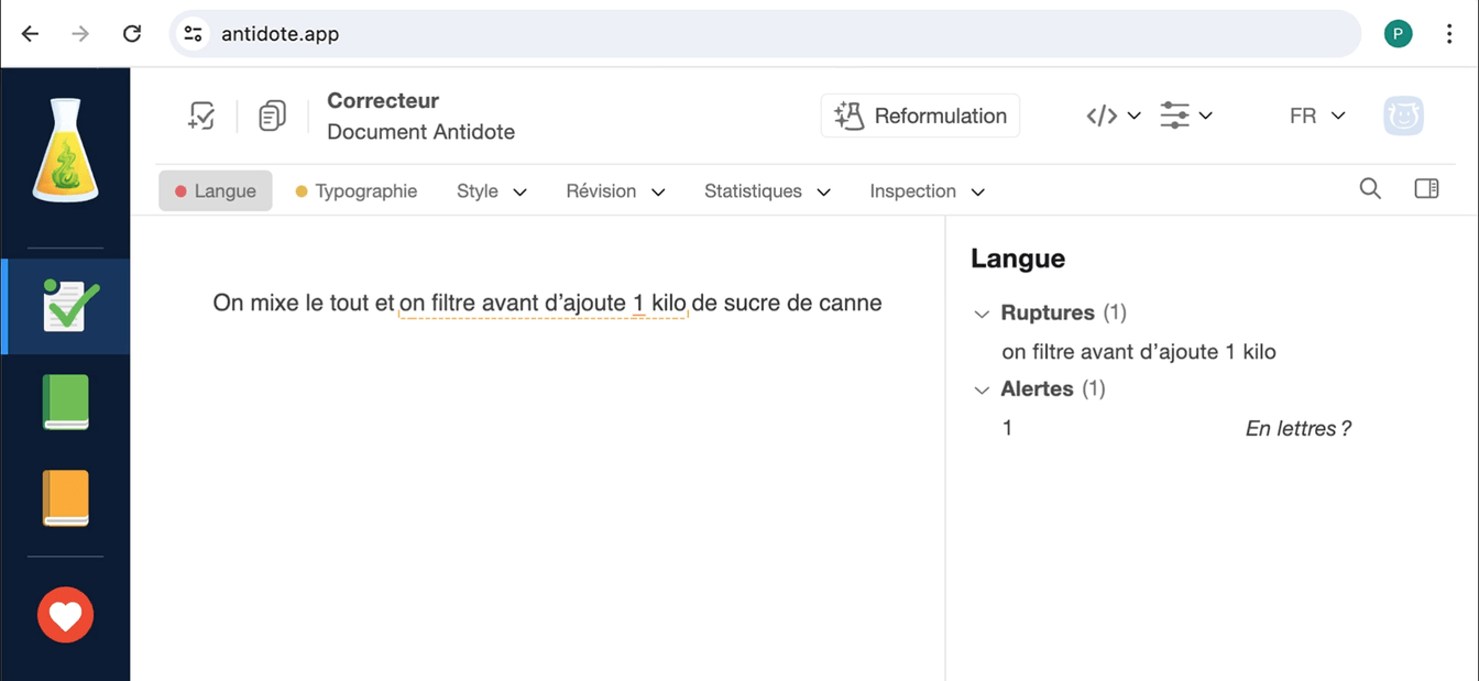 MP : Pour vous donner un exemple concret dans Antidote, vous pouvez maintenant utiliser la reformulation pour résoudre un signalement de rupture — ces passages que notre correcteur souligne par un trait orangé pointillé pour indiquer là où son analyse bute.